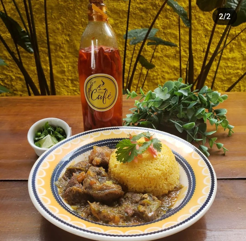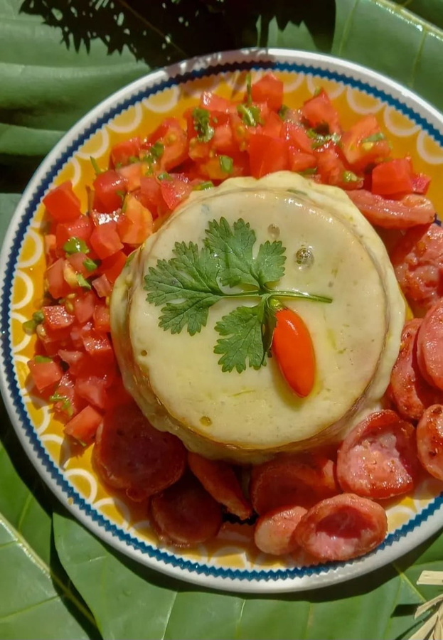 FLOCOS de milho ou de arroz c/ margarina, carne de sol, mussarela, queijo frito, banana frita e creme de alho