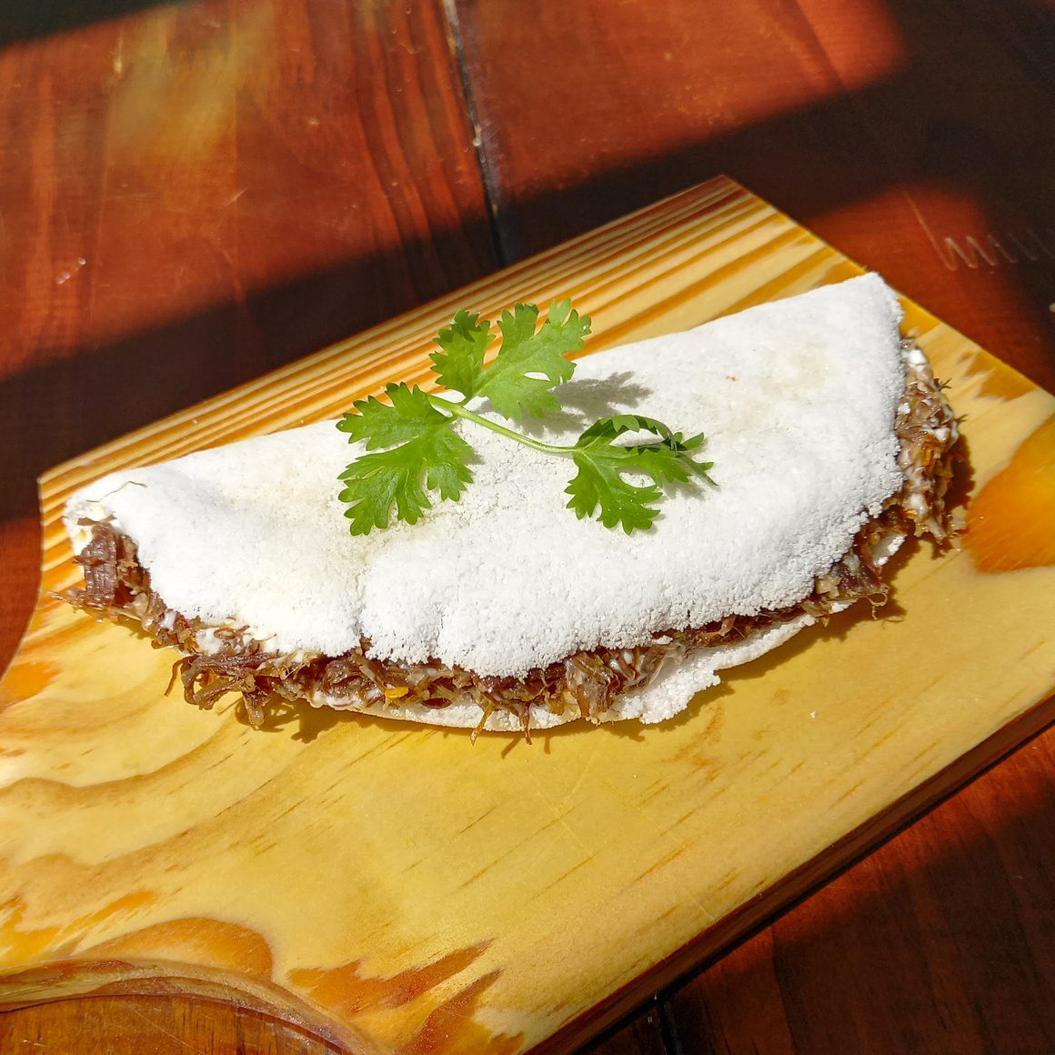 Flocos de milho, carne de sol, vinagrete, cheddar e mussarela